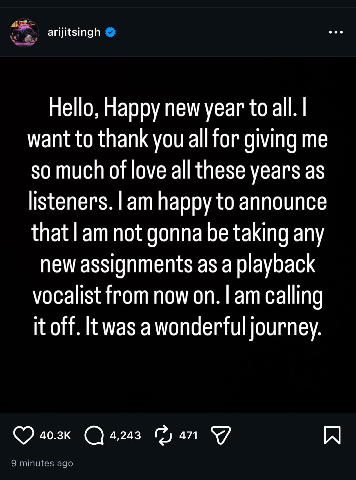 গায়ক এও স্পষ্ট করে দিয়েছেন, তিনি ছবিতে গান গাইবেন না। কিন্তু তাঁর মিউজিক্যাল কেরিয়ার থমকাচ্ছে না। অর্থাৎ অন্যত্র সঙ্গীতচর্চা যেমন করছেন করবেন। কিন্তু কেন এই অবসর? তার কারণও জানিয়েছেন সেই সোশ্যাল মিডিয়া পোস্টের কমেন্টে। স্বাভাবিক ভাবেই এমন ঘোষণা মনখারাপ অনুরাগীদের। অকস্মাৎ এমন ঘোষণা অনেকেরই বিশ্বাস হচ্ছে না।অনুরাগীদের এই একটাই প্রশ্ন, কেন গায়ক হঠাৎ এই সিদ্ধান্ত নিলেন। তারই উত্তরে কমেন্টে অরিজিৎ লেখেন,এর একটা কারণ আছে। নতুন কোনও গায়ক উঠে এসে আমাকে সত্যিকারের অনুপ্রেরণা দেবে, এই অপেক্ষায় আমি রইলাম।”