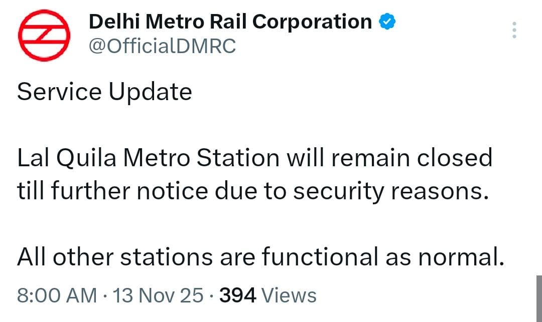ডিএমআরসি বিবৃতিতে জানিয়েছে, নিরাপত্তা ও তদন্তের স্বার্থে লাল কেল্লা মেট্রো স্টেশন বন্ধ রাখা হয়েছে। তবে লাল কেল্লা ছাড়া অন্যান্য স্টেশন স্বাভাবিকভাবেই চালু রয়েছে। পুরনো দিল্লি এলাকায় নিত্য যাত্রীদের অসুবিধা এড়াতে জামা মসজিদ বা দিল্লি গেটের মতো কাছাকাছি স্টেশনগুলি ব্যবহার করার পরামর্শ দেওয়া হয়েছে।