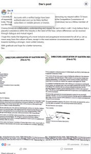 দেব সাংবাদিক সম্মেলন করে বলেন, রাহুল টলিউডকে এক করে দিয়ে গিয়েছে। কিন্তু টলিউডে যে সমস্ত শিল্পীরা কাজ করতে পারছিলেন না, সেটাও তাঁদের কাছে ভীষণ কষ্টের। সেই জন্য দেব প্রসেনজিৎ চট্টোপাধ্যায়কে দায়িত্ব দেন যে, ৭২ ঘণ্টার মধ্যে সমস্ত ব্যান হয়ে থাকা শিল্পীরা যাতে কাজে ফেরেন, তার জন্য স্বরূপ বিশ্বাসের সঙ্গে কথা বলবেন প্রসেনজিৎ চট্টোপাধ্যায়। অন্যান্য আইনি বিষয়গুলি ও দেখবেন। আর ৭২ ঘণ্টা কাটার আগেই, সোশ্যাল মিডিয়ায় ‘সুখবর’ দিলেন দেব নিজেই। সেই চিঠিতে উল্লেখ রয়েছে যে, ফেডারেশনের সঙ্গে সমঝোতার প্রস্তাবে রাজি হয়েছে ‘ডিরেক্টরর্স গিল্ড’। ৯ এপ্রিল ডিরেক্টরদের সংগঠনের তরফে এক গুরুত্বপূর্ণ চিঠি পাঠানো হয় প্রসেনজিৎকে। চিঠিতে স্পষ্ট জানানো হয়, তাঁরা সিসিআই-তে দায়ের করা মামলা প্রত্যাহারের প্রক্রিয়া শুরু করতে প্রস্তুত। শুধু তাই নয়, পৃথকভাবে দায়ের হওয়া ফেডারেশন সভাপতি স্বরূপ বিশ্বাসের বিরুদ্ধে মানহানির মামলাগুলিও তুলে নেওয়ার জন্য সংশ্লিষ্ট সদস্যদের সঙ্গে কথা বলবেন তাঁরা। তবে এই সিদ্ধান্ত শর্তসাপেক্ষ—যে সব নিষেধাজ্ঞা এতদিন ধরে পরিচালক ও অভিনেতাদের কাজের পথে বাধা হয়ে দাঁড়িয়েছিল, সেগুলি সম্পূর্ণভাবে তুলে নেওয়ার নিশ্চয়তা চাইছেন তাঁরা। চিঠিতে আরও উল্লেখ করা হয়, এই সমস্যার কারণে ডিএইআই-এর অন্তত ৩৫৮ জন সদস্য পেশাগতভাবে ক্ষতিগ্রস্ত হয়েছেন। তাই সমাধান চাইলে তা হতে হবে পারস্পরিক এবং নীতিগত ভিত্তিতে।