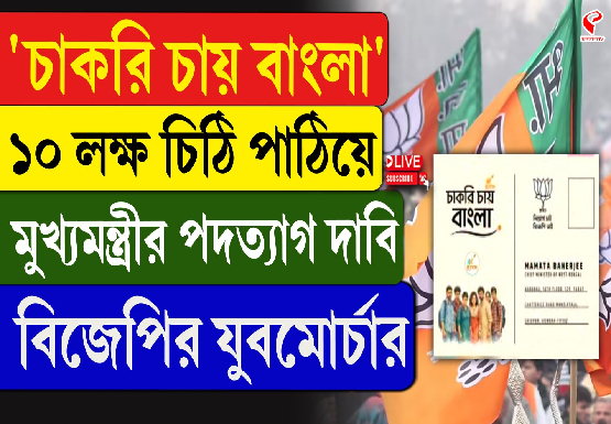 ‘চাকরি চায় বাংলা’ (chakri chai Bangla) ১০ লক্ষ চিঠি পাঠিয়ে মুখ্যমন্ত্রীর পদত্যাগ দাবি বিজেপি যুব মোর্চার। বিধানসভা ভোটের আগেই বিজেপির এক নয়া রাজনৈতিক কৌশল ঘিরে তীব্র চাপানউতোর তৈরি হয়েছে। এই কর্মসূচিতে যুবক-যুবতীদে সই করিয়ে চিঠি পাঠানো হবে নবান্নে। বিজেপি সূত্রে খবর, ‘চাকরি চায় বাংলা’য় ১৮ থেকে ৪০ বছর যুবক যুবতীরা সই করতে পারবে।