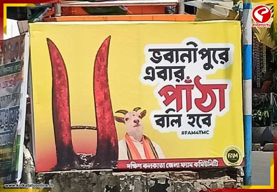 সম্প্রতি ভবানীপুরে একটি ব্যানার ঘিরে চর্চা তুঙ্গে। সেখানে লেখা, ‘ভবানীপুরে এবার পাঁঠাবলি হবে’। ব্যানারটির নিচে ‘দক্ষিণ কলকাতা ফ্যাম কমিউনিটি’-র নাম উল্লেখ রয়েছে। ব্যানারের পাশে একটি হাঁড়িকাঠের ছবি এবং তার সঙ্গে একটি পাঁঠার মুখ ব্যবহার করা হয়েছে। অভিযোগ উঠেছে, সেই পাঁঠার মুখটি বিরোধী দলনেতা শুভেন্দু আধিকারীর মুখের আদলে তৈরি।