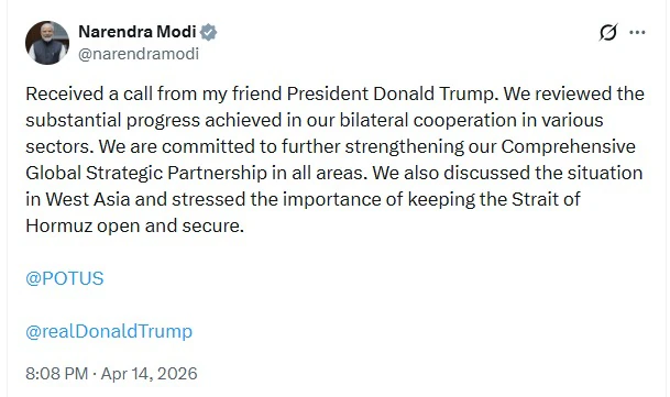 ফোনালাপের পর প্রধানমন্ত্রী মোদি নিজের সোশ্যাল মিডিয়া হ্যান্ডলে জানান, বন্ধু ট্রাম্পের সঙ্গে তাঁর ফলপ্রসূ আলোচনা হয়েছে। তিনি জোর দিয়ে বলেন, ভারত ও আমেরিকা উভয়েই হরমুজ প্রণালীকে উন্মুক্ত ও নিরাপদ রাখার পক্ষে। আন্তর্জাতিক বাণিজ্য ও জ্বালানি সরবরাহের স্বার্থে এই পথের গুরুত্ব অপরিসীম বলেও উল্লেখ করেন তিনি।