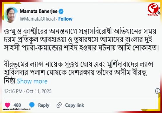 জম্মু ও কাশ্মীরের অনন্তনাগে সন্ত্রাসবিরোধী অভিযানের সময় চরম প্রতিকূল আবহাওয়া ও তুষারধসে আমাদের বাংলার দুই সাহসী প্যারা-কমান্ডোর শহিদ হওয়ার ঘটনায় আমি শোকাহত।