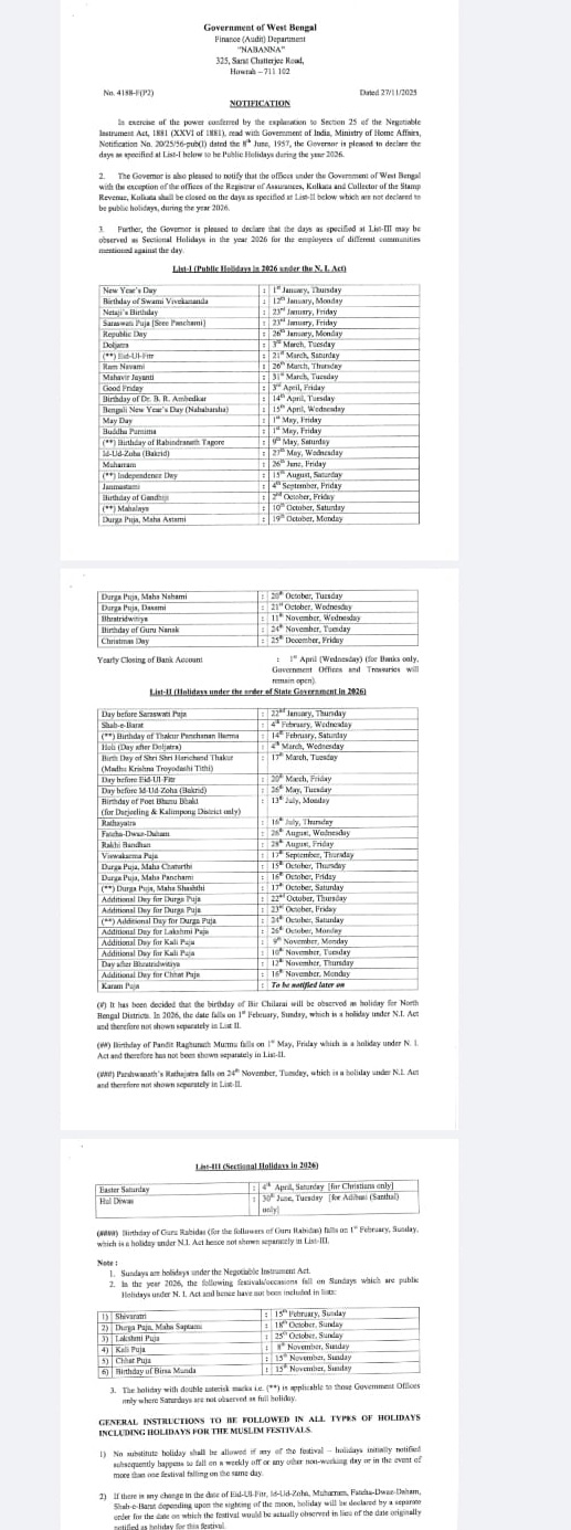 ২০২৬ সালের ছুটির তালিকা প্রকাশ করল নবান্ন, দেখুন সেই লিস্ট