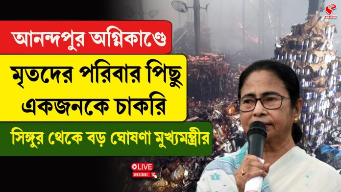 আনন্দপুরের অগ্নিকাণ্ডে মৃত এবং নিখোঁজদের পরিবারকে আর্থিক সাহায্য করা হবে। মঙ্গলবার ঘটনাস্থল পরিদর্শনের পর এ কথা জানিয়েছিলেন কলকাতার মেয়র তথা রাজ্যের পুরমন্ত্রী ফিরহাদ হাকিম (Firhad Hakim)।সিঙ্গুরের সভা থেকে মমতা বন্দ্যোপাধ্যায় বলেন, “কাল আমাদের কিছু বন্ধু প্রাইভেট কোম্পানিতে কাজ করতে গিয়ে মারা গিয়েছেন। আমি ববিকে পাঠাই, অরূপকে পাঠাই।” তিনি ঘোষণা করেন, “মৃতদের পরিবারকে ১০ লক্ষ টাকা করে ক্ষতিপূরণ দিচ্ছে। মোমো কোম্পানি ও ডেকরেটর্স কোম্পানি ৫ লক্ষ টাকা করে দিচ্ছে। পুলিশকে বলেছি, মৃতদের পরিবারের একজনকে সিভিকে চাকরি দেওয়ার জন্য।