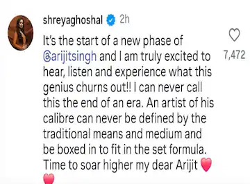 সোশ্যাল মিডিয়ায় অরিজিৎ মঙ্গলবার সন্ধেয় জানিয়েছিলেন, তিনি আর সিনেমার গানের কাজ হাতে নেবেন না। তবে তার একটু পরেই পোস্ট করে অরিজিৎ স্পষ্ট করে দেন, তিনি সিনেমার গান ছাড়ছেন তার মানে এটা নয় যে তিনি সঙ্গীত জগৎ থেকে বিদায় নিচ্ছেন। তিনি নতুন কিছু নিয়ে ফিরবেন। কিন্তু সেটা কী, তার কোনও ইঙ্গিত দেননি অরিজিৎ। অরিজিতের এই সিদ্ধান্তে একেবারেই হতাশ নন শ্রেয়া ঘোষাল। বরং এই পরিসমাপ্তির মধ্যেই তিনি দেখছেন এক নতুন যাত্রার ইঙ্গিত। শেষের মধ্যেই যে নতুন শুরুর সম্ভাবনা লুকিয়ে আছে, সে কথাই যেন বিশ্বাস করেন শ্রেয়া। শ্রেয়া অরিজিতের অবসর ঘোষণার পোস্টের কমেন্টে লিখেছেন, ‘এটা অরিজিতের জীবনের এক নতুন অধ্যায়ের শুরু। এই প্রতিভাবান শিল্পী এবার কী সৃষ্টি করেন, তা শুনতে ও অনুভব করতে আমি সত্যিই মুখিয়ে আছি।