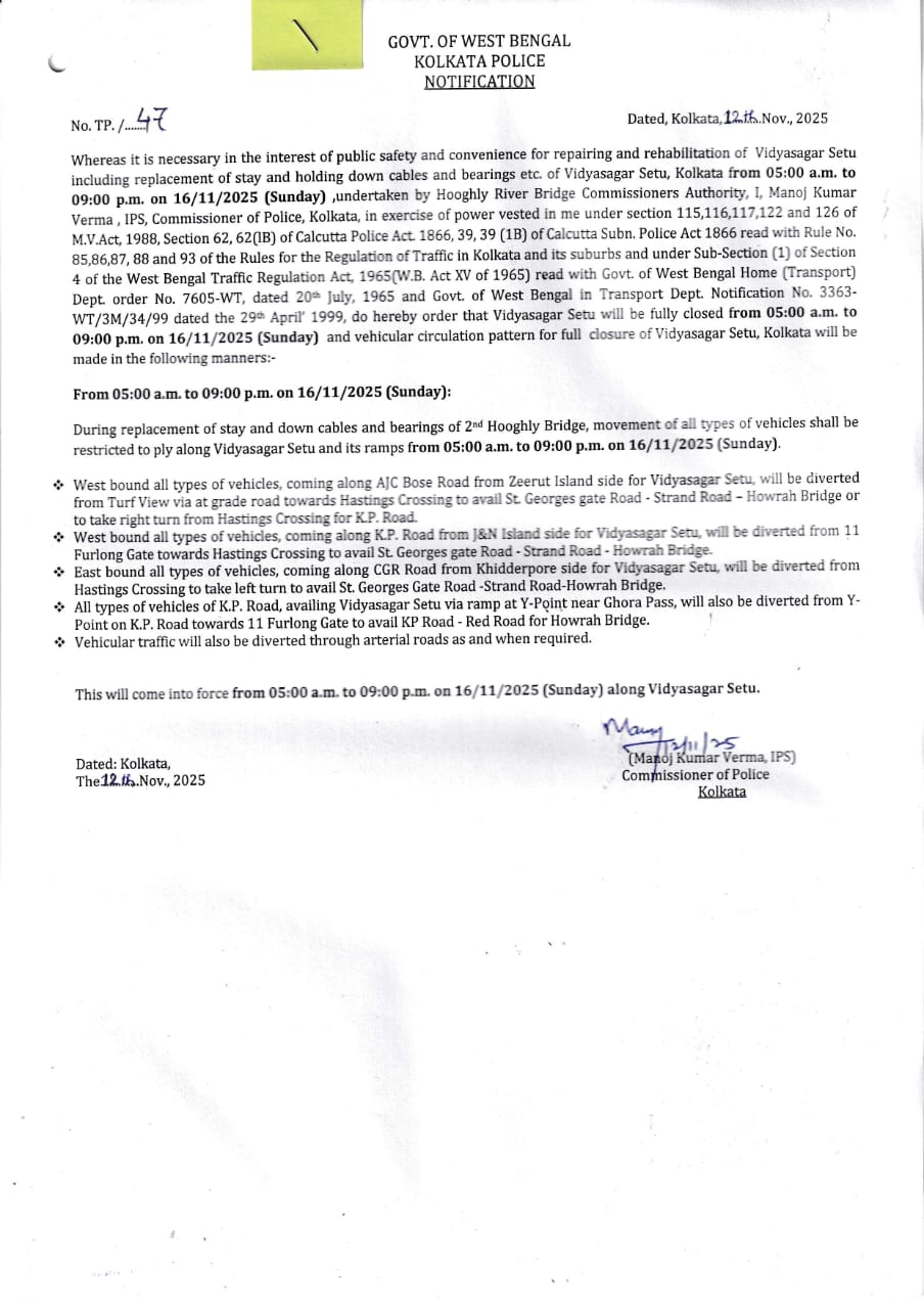 কলকাতা: রবিবার ফের বন্ধ বিদ্যাসাগর সেতু বা দ্বিতীয় হুগলি সেতু (Vidyasagar Setu)। রক্ষণাবেক্ষণ ঘিরে ফের বড়সড় পরিবর্তন আসতে চলেছে শহরের ট্রাফিকে। কলকাতা পুলিশের বিজ্ঞপ্তি (Kolkata Police Traffic Advisory) অনুযায়ী, রবিবার, ১৬ নভেম্বর ভোর থেকে রাত পর্যন্ত সম্পূর্ণভাবে বন্ধ থাকবে বিদ্যাসাগর সেতু। এই সময় সেতুর উপর দিয়ে কোনও যান চলাচলই করবে না (Vidyasagar Setu closed November 16)।