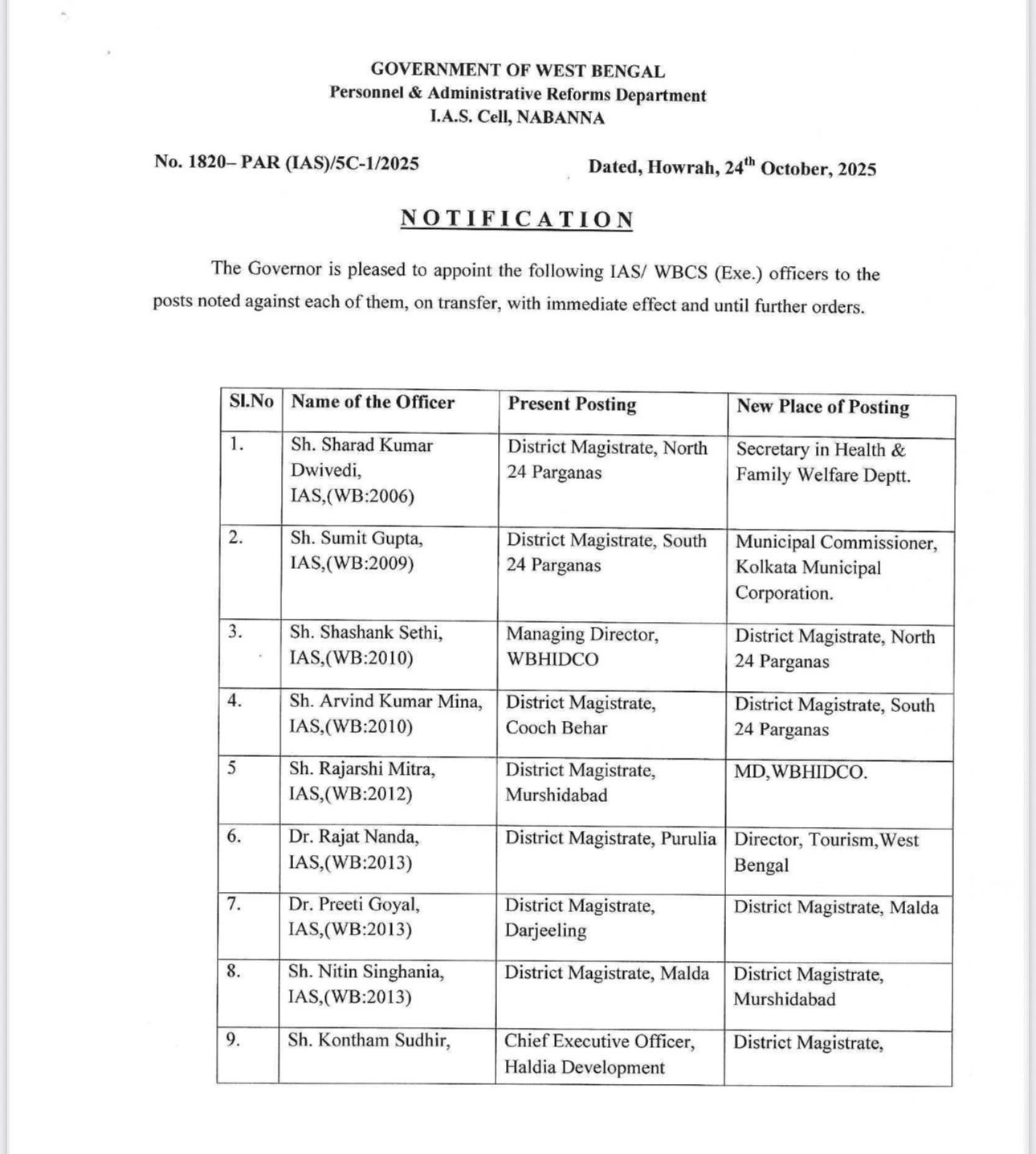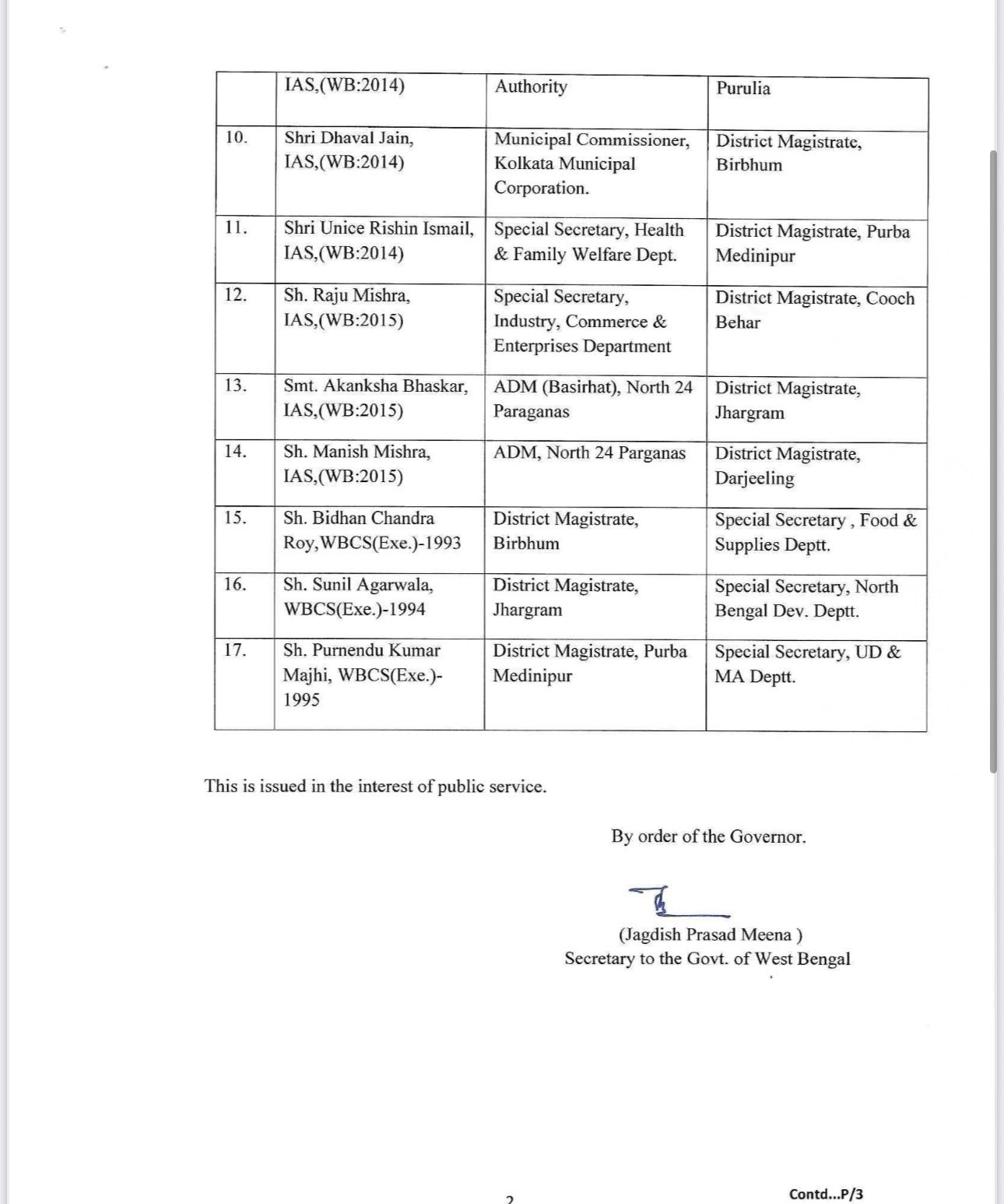 উত্তর ২৪ পরগনা জেলাশাসক শরৎকুমার দ্বিবেদীকে স্বাস্থ্য দফতরের সচিব করা হল। উত্তর ২৪ পরগনা জেলার নয়া জেলা শাসক হলেন শশাঙ্ক শেট্টি। দক্ষিণ ২৪ পরগনা জেলার জেলাশাসক সুমিত গুপ্তাকে বদলি করা হল। দক্ষিণ ২৪ পরগনা জেলার নয়া জেলাশাসক হলেন কোচবিহারের জেলাশাসক অরবিন্দ কুমার মিনা। মুর্শিদাবাদ জেলাশাসক রাজশ্রী মিত্র কে বদলি করা হল। মালদা জেলার জেলাশাসক নীতিন সিংহানিয়াকে মুর্শিদাবাদ জেলার জেলাশাসক করা হল। পুরুলিয়া জেলার জেলাশাসক রজত নন্দাকে বদলি করা হল। পুরুলিয়া জেলার নয়া জেলা শাসক হলেন হলদিয়া ডেভেলপমেন্ট অথরিটি চিফ এক্সিকিউটিভ অফিসার কনঠাম সুধীর। দার্জিলিং জেলার জেলাশাসক প্রীতি গোয়েল বদলি হয়ে গেলেন মালদা জেলায়।
