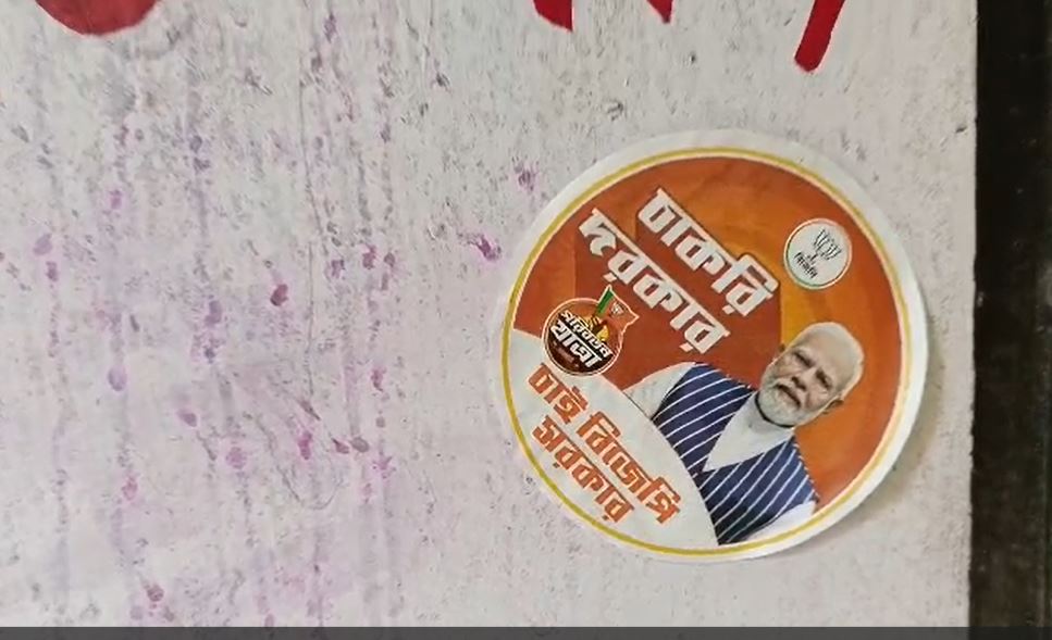 ওয়েবডেস্ক- স্কুলের দেওয়ালে রবীন্দ্রনাথের ছবির ওপর বিজেপির স্টিকার (BJP Sticker) । তাতে প্রধানমন্ত্রী নরেন্দ্র মোদির ছবি(Narendra Modi) এবং স্লোগান “চাকরি দরকার তাই বিজেপি সরকার।” সৌজন্যে বিজেপির পরিবর্তন যাত্রা। আর এই ছবি ভাইরাল হতেই শুরু হয়েছে রাজনৈতিক বিতর্ক। ভোটের মুখে প্রশ্ন উঠছে, বিজেপি কি বাংলা বিরোধী?
