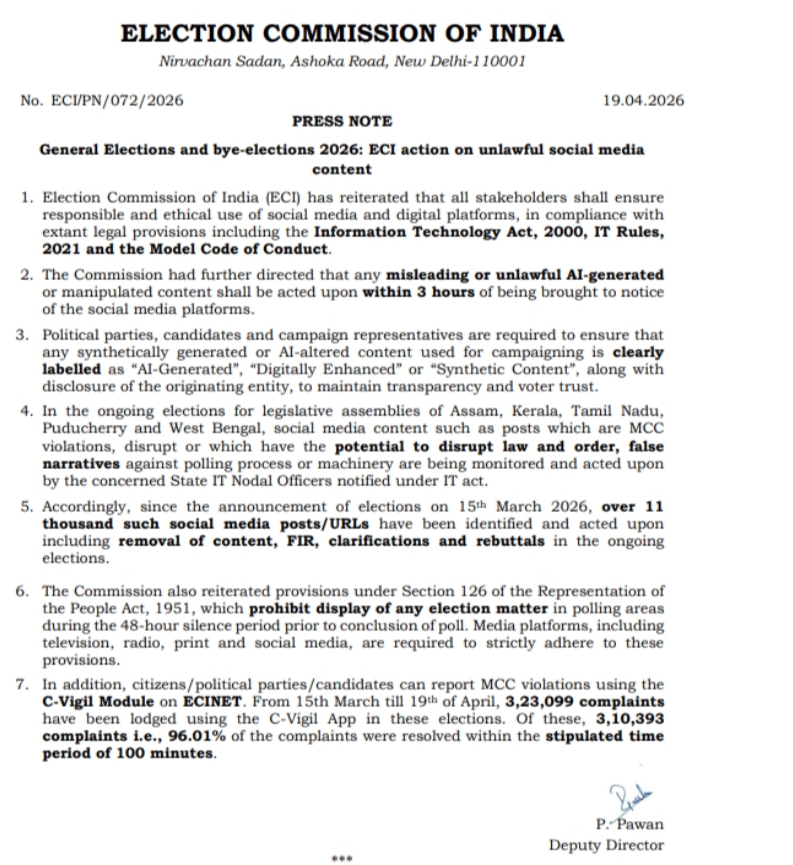 সংশ্লিষ্ট প্ল্যাটফর্মকে তা সরিয়ে ফেলতে হবে তিন ঘণ্টার মধ্যে। কৃত্রিম ভাবে (AI) তৈরি কোনও ছবি ব্যবহার করলে ‘এআই জেনারেটেড’ লিখতে হবে। ভোটের নির্ঘণ্ট ঘোষণার পর থেকে এপর্যন্ত প্রায় ১১ হাজারেরও বেশি পোস্ট চিহ্নিত করে আইনি পদক্ষেপ হয়েছে। ভোটগ্রহণের আগের ৪৮ ঘণ্টা টিভি, রেডিও বা সোশ্যাল মিডিয়ায় কোনওরকম প্রচার নয়। বিবৃতি দিয়ে জানাল নির্বাচন কমিশন।
