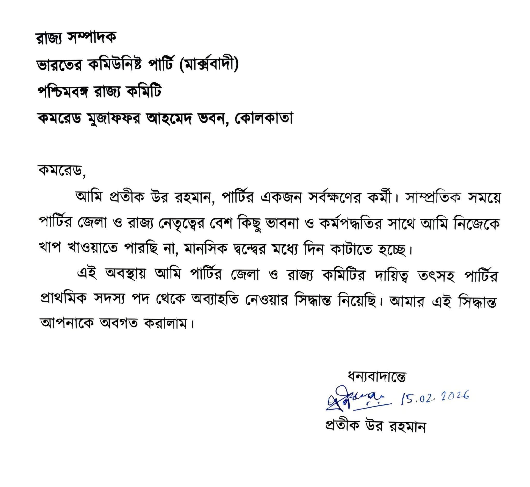 চিঠিতে নৈতিকতার প্রসঙ্গকে গুরুত্ব দিয়ে জেলা ও রাজ্য নেতৃত্বের ভাবনা ও কর্মপদ্ধতির সঙ্গে খাপ খাওয়াতে না পারার কথা উল্লেখ করা হয়েছে। মানসিক দ্বন্দ্বের কথা জানিয়ে ওই নেতা বর্তমান পরিস্থিতি থেকে অব্যহতি চেয়েছেন প্রতীক উর রহমান। পাশাপাশি, পার্টির প্রাথমিক সদস্যপদ থেকেও সরে দাঁড়ানোর আবেদন জানিয়েছেন বলেই জানা যাচ্ছে। যদিও আলিমুদ্দিনের তরফে এখনও পর্যন্ত এ বিষয়ে কোনও আনুষ্ঠানিক প্রতিক্রিয়া দেওয়া হয়নি।