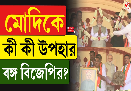 মঞ্চে তাঁর একপাশে ছিলেন শুভেন্দু অধিকারী আর অপরদিকে বঙ্গ বিজেপির রাজ্য সভাপতি শমীক ভট্টাচার্য। এদিন মঞ্চে প্রধানমন্ত্রীকে বরণ করে নেন বিজেপি নেতা মন্ত্রীরা। প্রথমে তাঁকে মালা ও পরে প্রধামন্ত্রীর গলায় উত্তরীয় পরিয়ে দেন বিরোধী দলনেতা শুভেন্দু অধিকারী। এর পর বঙ্কিমচন্দ্র চট্টোপাধ্যায়ের একটি চিত্র প্রধানমন্ত্রীর হাঁতে তুলে দেন শমীক ভট্টাচার্য। মা দুর্গার একটি মূর্তিও তাঁর হাতে তুলে দেন শুভেন্দু অধিকারী।